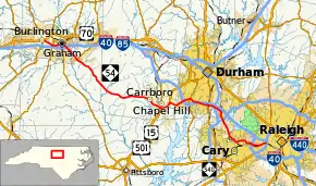NC 54 follows Chapel Hill Road to the intersection of NC 49/NC 100 (Maple Avenue) in downtown Graham. NC 54 joins NC 49 north on Harden Street through downtown. The route roughly parallels I-40 to the south as it enters into the downtown area of Graham. NC 49/NC 54 turns to the northeast before intersecting NC 87 (West Elm Street). After the intersection, the road turns east and follows along a concurrency with NC 49 and NC 87. NC 87 turns off at Main Street in downtown Graham. Three blocks to the east, NC 49 exits at East Elm Street. NC 54 begins its turn southeast and crosses I-40/I-85 at its exit 148. NC 54 remains on Harden Street until it crosses the Haw River and is known from that point solely as NC 54.[1][2]