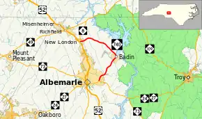 Established around 1930 as a spur of NC 74 (renumbered NC 73 in 1934), it connected Albemarle to the town of Badin then back to New London, ending at NC 80 (current NC 8). In 1933, it was extended north, replacing some of NC 62; but then reverted to original terminus in 1935, replaced by NC 62A and later NC 8. In the mid-1950s, NC 740 moved south from Badin Road to a new terminus with NC 27. In the early 1980s, NC 740 was overlapped with NC 8 and extended .2 miles (0.32 km) to its current northern terminus.[2]