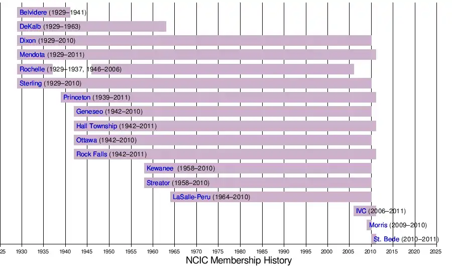 Until the departure of the Rochelle Hubs in 2006, the NCIC's 42-year span of unchanged membership was the longest of any high school conference.[1] However, that one change sent shockwaves through the rest of the conference, ultimately resulting in the dissolution of the NCIC at the end of the 2010-11 school year.