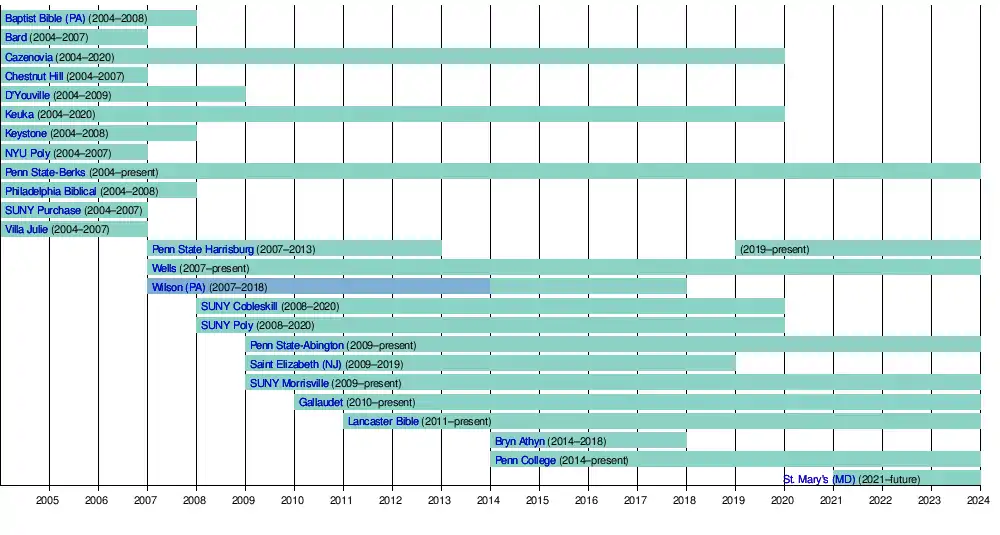 Changes in the NEAC membership have continued to the present. On August 30, 2017, Bryn Athyn and Wilson announced that they would leave the NEAC for the Colonial States Athletic Conference effective with the 2018–19 school year.[1] The next change of membership came in 2019–20 with the return of Penn State Harrisburg[2] and the departure of Saint Elizabeth for the Colonial States Athletic Conference.[3] In July 2020, the NEAC lost four members, with Keuka departing for the Empire 8 Conference[4] and Cazenovia, SUNY Cobleskill, and SUNY Poly leaving for the North Atlantic Conference.[5] The NEAC membership will return to 9 in 2021 with the arrival of St. Mary's College of Maryland.[6]