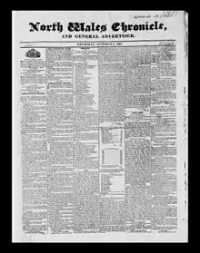 ![]() Front page of the earliest surviving copy of the Welsh newspaper North Wales Chronicle; 4 October 1827 | |