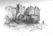 The castle was built under the stewardship of Simon de Senlis, the first Earl of Northampton, in 1084.[3] It took several years to complete, as there is no mention of it in the Domesday Book, the great survey of England completed in 1086. In the reign of Henry II, the castle was in the hands of the Crown. In the civil wars between King John and his barons, the latter used it as a stronghold. When the King prevailed, the castle was entrusted to Falkes de Breauté, whom the King admired for his courage during the war.[4]