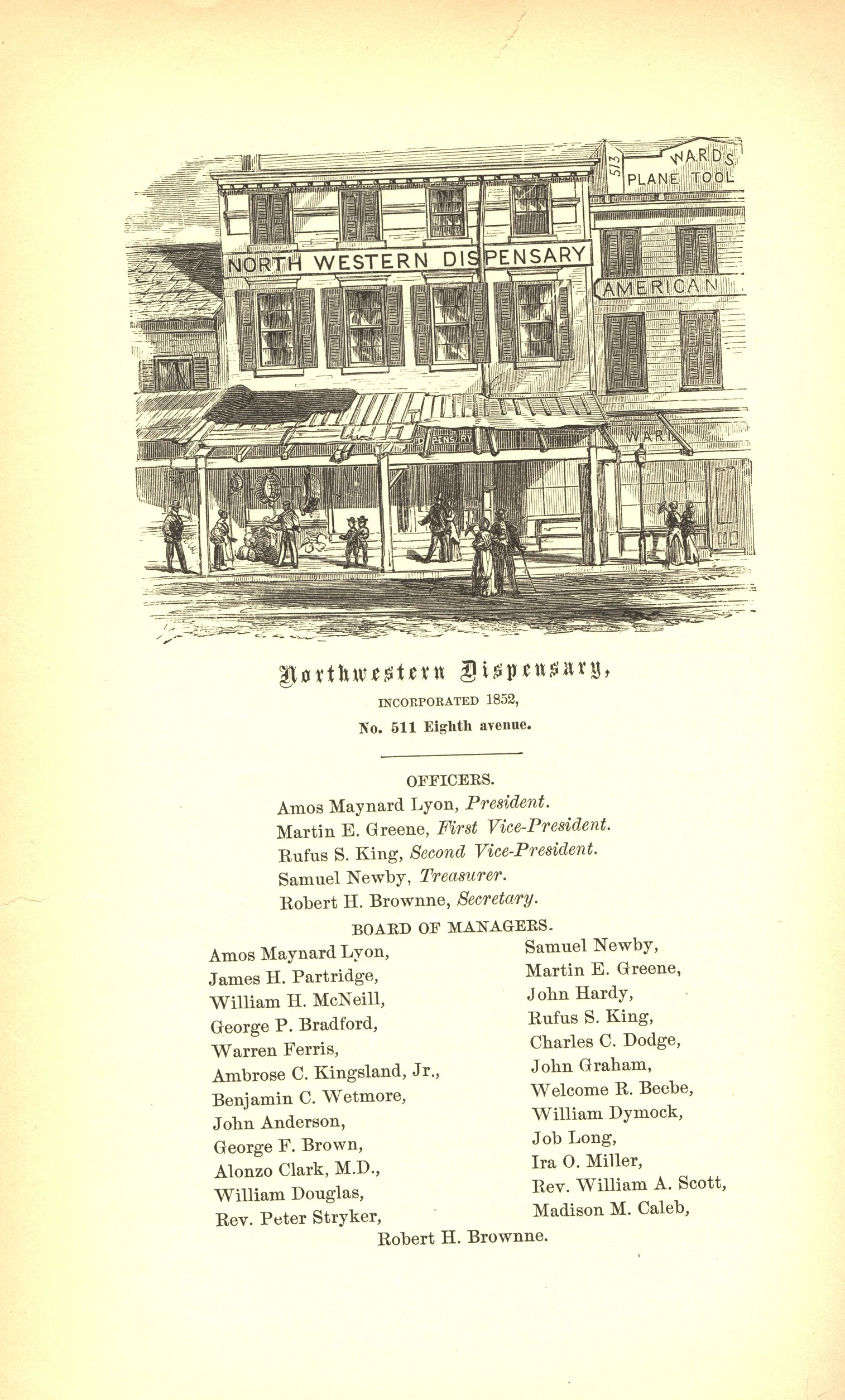 - This was their second location. "North-western Dispensary, (Incorporated 1852). Ninth Avenue, corner Thirty-sixth Street". Museum of the City of New York (MCNY).