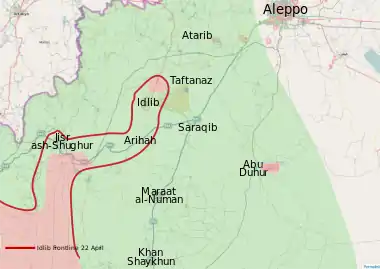 On 17 May, according to an opposition source, more than 2,500 rebels attacked Mastouma and the nearby Ba'ath military camp.[185] During the attack, an VBIED was detonated near the military camp, while rebels captured al-Moqbili village and advanced in Mastouma, where they captured at least 10 checkpoints[186] and Mastouma hill. Meanwhile, the Syrian army claimed to have advanced towards Kufayr.[53]