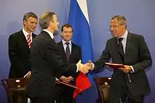 During a meeting in Oslo on 27 April 2010, President of Russia Dmitry Medvedev and Prime Minister of Norway Jens Stoltenberg announced that the territorial dispute in the Barents Sea was settled.[48][49] The agreement is a compromise which divides a disputed area of around 175,000 square kilometers (68,000 sq mi) into two approximately equally sized parts.[42] The agreement was signed on 15 September 2010 in Murmansk by Medvedev and Stoltenberg.[50][51] The Parliament of Norway unanimously approved the treaty on 8 February 2011. The debate lasted only an hour, and all representatives of Norwegian political parties praised the agreement.[52] On 30 March, Russia's State Duma also voted in support of ratification, despite strong opposition from Communist Party representatives.[53] Medvedev signed a law ratifying the treaty on 8 April 2011. The law was titled Federal Law on Ratification of the Treaty between the Russian Federation and the Kingdom of Norway on Maritime Delimitation and Cooperation in the Barents Sea and the Arctic Ocean.[50] After ratification by both countries, there was a 30-day waiting period before it would come into force.[54]