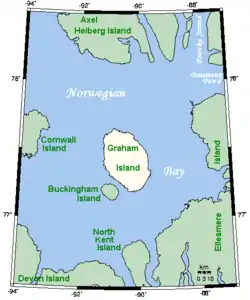 Norwegian Bay (French: Baie Norvégienne) is an Arctic Ocean waterway in the Qikiqtaaluk Region of Nunavut, Canada. Amund Ringnes Island is to the northwest (separated by the Hendriksen Strait from Cornwall Island), and Axel Heiberg Island is to the north. (Both Amund Ringnes Island and Axel Heiberg Island are part of the Sverdrup Islands.) Ellesmere Island is to the east, and Devon Island is to the south.