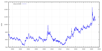 However, in late 2007 and early 2008, the USD suffered a steady depreciation against all other major currencies. The Norwegian krone was gaining value at the same time; as a result, the Norwegian krone became stronger than ever compared to the USD, making the USD worth about 5 NOK in April 2008. By October 2008, the USD had recovered and was worth approximately 7 NOK. Following 2009, the NOK has once again seen strong growth, making the USD worth about 5.8 NOK as of the beginning of 2010. Since then, the USD has gone up further and as of October 2019 is worth about 9 NOK. During the COVID-19 pandemic, the NOK fell heavily, making one USD cost 12.00 NOK on 19 March 2020.