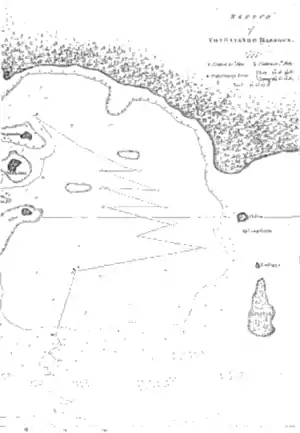 - At length, about two in the afternoon, we arrived at our intended station. It was a very snug place, formed by the shore of Tongataboo on the South East, and two small islands on the East and North East. Here we anchored in ten fathoms water, over a bottom of oozy sand; distant from the shore one-third of a mile [500 m]."[1]