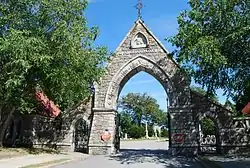 Oak Grove Cemetery is a historic cemetery located at 765 Prospect Street in Fall River, Massachusetts. It was established in 1855 and greatly improved upon in the years that followed. It features Gothic Revival elements, including an elaborate entrance arch constructed of locally quarried Fall River granite. The cemetery originally contained 47 acres, but has since been expanded to over 120 acres. The cemetery is the city's most significant, built in the planned rural-garden style of Mount Auburn Cemetery in Cambridge, Massachusetts. It was designed and laid out by local architect Josiah Brown, who is also known for his designs of early mills including the Union, Border City, and others.[2]