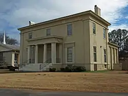 Oak Place (also known as the Steele-Fowler House) is a historic residence in Huntsville, Alabama. It was built by renowned Huntsville architect George Steele in 1840 on 320 acres (130 ha).[2] Steele designed a number of buildings across the South, including the First National Bank building in Huntsville, and the second Madison County Courthouse, which stood from 1840 until 1914. Similar to many of his buildings, Steele designed Oak Place house in a Greek Revival style, although much more restrained in detail. The house has a low hipped roof, and is three stories, although it appears as two stories with a basement due to its unusual interior layout. The façade has three steps leading to a one-story, flat-roofed portico supported by two square Doric columns on the corners and two fluted Doric columns in the middle. The entablature is the most decorated part of the house, although it is limited to groups of vertical strakes. Windows flanking the portico are six-over-nine sashes surrounded by square pilasters and Doric capitals with plain entablature and cornice.[3] The interior layout was different than the standard home of the day. It features a central entrance hall, with a large ballroom with 14-foot (4.2-m) ceilings to one side, and two smaller rooms several steps above on the other. In the basement below the two smaller rooms is a dining room, taking advantage of the higher ceiling. There are four bedrooms on the second floor. Like the exterior, the interior was restrained. Many details were lost when it was converted from a house to a church school building by the East Huntsville Baptist Church.[4] The house was listed on the National Register of Historic Places in 1974.[1]