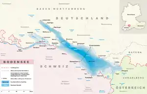 The countries that border the lake are Switzerland, with its cantons of Thurgau and St. Gallen, Austria, with its federal state Vorarlberg, and Germany, with its federal states of Baden-Württemberg and Bavaria. The border between the riparian states on the south-eastern main part of the Obersee have never been jointly agreed (see Lake Constance); only the smaller northwestern water of Lake Überlingen is completely German territory.