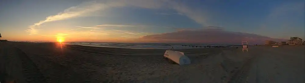 Since 1951, the beach has been replenished more than 40 times, potentially the most of any beach in the country. This is due to erosion caused by storms, and in an extreme instance of erosion, a $5 million replenishment project in 1982 had largely disappeared within two and a half months. During the 1960s and 1970s, the city owned its own dredge, but ceased replenishment projects when it could not secure permits for dredging the lagoons.[55] Since 1992, the United States Army Corps of Engineers has handled responsibility for beach nourishment projects, periodically adding 1,100,000 cubic yards (840,000 m3), roughly every three years, using the shoal area about 5,000 feet (1,500 m) offshore the Great Egg Harbor Inlet. The project and funding was authorized in the Water Resources Development Act of 1986,[50] and the most recent replenishment was completed in December 2017.[56] After Hurricane Sandy in 2012, the Army Corps completed the city's largest beach replenishment since 1993, adding 1,800,000 cubic yards (1,400,000 m3) of sand to replenish the eroded beaches.[50]