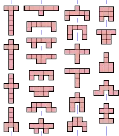 An octomino (or 8-omino) is a polyomino of order 8, that is, a polygon in the plane made of 8 equal-sized squares connected edge-to-edge.[1] When rotations and reflections are not considered to be distinct shapes, there are 369 different free octominoes. When reflections are considered distinct, there are 704 one-sided octominoes. When rotations are also considered distinct, there are 2,725 fixed octominoes.[2][3]