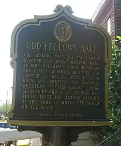 Odd Fellows Hall is a former meeting hall of the Crescent Lodge No. 3 of the Independent Order of Odd Fellows. It is located on Commerce Street in Occoquan, Virginia. The Hall was erected in 1889 by volunteer Lodge members and a paid carpenter. The first floor of the Hall has been continuously used as a public meeting room and theater. The Odd Fellows reserved the second floor for their meetings. The Masons, American Legion, church congregations and other groups have met in the Hall over the years.