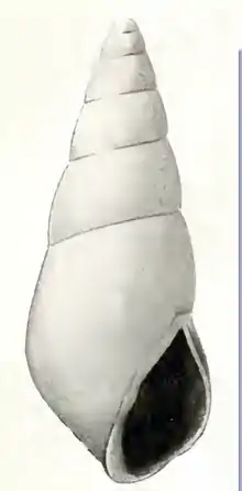 The bluish white shell is rather large, its length measuring 5.8 mm. It has an elongate conic shape. The whorls of the protoconch are obliquely immersed in the first of the succeeding turns, above which the tilted edge of the last volution only projects. The almost seven whorls of the teleoconch are moderately rounded, and appressed at the summit. The early ones are marked by a moderate number of strongly incised lines, while on the later whorls the incised spiral lines are finer and much more numerous. In addition to the spiral sculpture the whorls are marked by decidedly retractively slanting, incremental lines. The suture is moderately constricted. The periphery of the body whorl is inflated, and feebly angulated. The base of the shell is attenuated, and moderately rounded. The aperture is oval, and somewhat effuse anteriorly. The posterior angle is acute. The outer lip is thin. The inner lip is very oblique, stout, slightly curved, reflected over and appressed to the base. It is provided with a strong oblique fold at its insertion. The parietal wall is covered with a thick callus.[1]