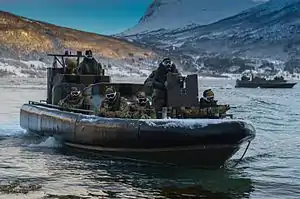 The Offshore Raiding Craft (ORC) is a small, fast boat used by the Royal Marines for troop insertion, and patrols.[1] The ORC is primarily used when undertaking strategic raiding missions, where speed and covertness is desired. However, it is equally capable when conducting larger scale amphibious operations alongside the larger and more traditional LCACs, LCUs and LCVPs. [2]