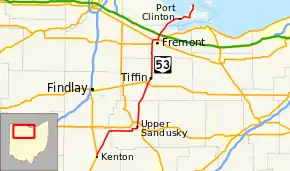 State Route 53 is a north–south state highway in the U.S. state of Ohio (physically northeast-southwest). Its southern terminus is at the beginning of the U.S. 68/S.R. 67 concurrency in Kenton, Ohio, and its northern terminus is on Catawba Island in Ottawa County, north of Port Clinton.
