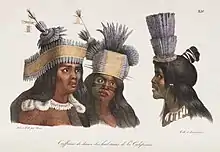 Generally, men did not wear clothing in warm weather. In cold weather, they might don animal skin capes or feather capes. Women commonly wore deerskin aprons, tule skirts, or shredded bark skirts. On cool days, they also wore animal skin capes. Both wore ornamentation of necklaces, shell beads and abalone pendants, and bone wood earrings with shells and beads. The ornamentation often indicated status within their community.[13]