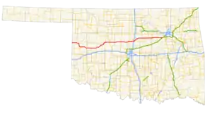 Oklahoma's State Highway 33 (abbreviated SH-33 or OK-33) is a major highway that traverses most of the state, and at one time traversed the entire state. Its general orientation is west to east. All mileages listed herein are from the western terminus of the highway at the Texas state line.