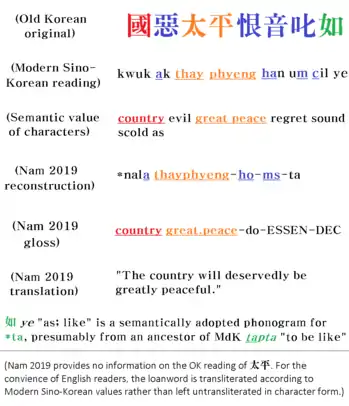 | Purpose of gloss | Shows that 種種 is to be read as a native Korean word with final *-s[lower-alpha 5] |