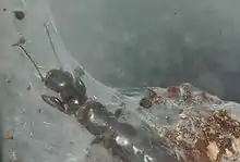 Researchers established a colony in the laboratory by placing two adult females and some eggs in a container with large flakes of bark behind which they could hide. The insects were supplied with dry goldfish food. Silken tubes were woven by the females after they had settled down, but the insects remained largely hidden, emerging only at night to feed. A male was seen some time later, indicating that the period to maturity was about four months. He produced his own longer tubes on the walls of the container, often remaining half out of the mouth of his gallery during the day, and sometimes venturing forth. The male did not feed, as is normal in this group, and lived for a few weeks. The eggs were laid in the tunnels and disguised within minutes by chewed bits of substrate so that they resembled the frass and substrate particles already adhering to the webbing; the eggs were not guarded by the female but the camouflage may have prevented cannibalism.[3] The next batch of larvae was seen some two months after the male was observed. Before this, the galleries had been expanded, seemingly in anticipation of the larvae hatching. Further expansion of the colony followed.[3]
