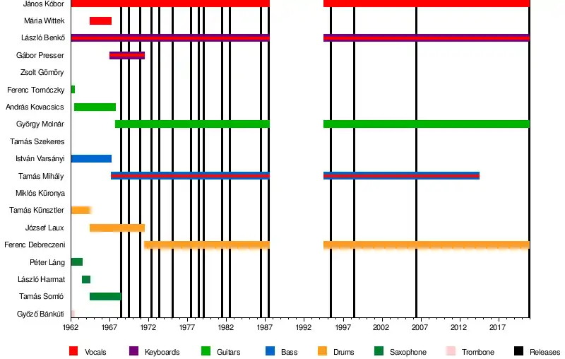 Omega was formed in Budapest in 1962 by Benkő and Kóbor, with trombonist Győző Bánkúti, drummer Tamás Künsztler, saxophonist Péter Láng, guitarist Ferenc Tornóczky, and bassist István Varsányi. The members had all been in previous bands at the same grammar school.[2][3][4] Their first concert was at Budapest's University of Technology and Economics in September 1962.[5][6] The band went through many personnel changes in its first several years, and mostly played covers of British rock songs.[1]