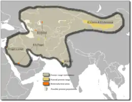 The onager formerly had a wider range from southwest and central to northern Asian countries, such as Israel, Saudi Arabia, Iraq, Jordan, Syria, Afghanistan, Russia, and Siberia, the prehistoric European wild ass subspecies ranged through Europe until the Bronze age.[5] During early 20th century, the species lost most of its ranges in the Middle East and Eastern Asia. Today, onagers live in deserts and other arid regions of Iran, Pakistan, India, and Mongolia, including in Central Asian hot and cold deserts of Kazakhstan, Uzbekistan, Turkmenistan, and China.[2]