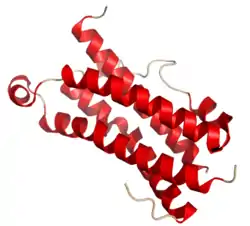 The three-dimensional structure of human OSM has been solved to atomic resolution, confirming the predicted long chain four helix bundle topology.[13] Comparing this structure with the known structures of other known LC cytokines shows it to be most closely related to LIF (RMSD of 2.1 Å across 145 equivalent Cα). A distinctive kink in the A helix arises from departure of the classical alpha helical H-bonding pattern, a feature shared with all known structures of LIFR using cytokines. This “kink” results in a different special positioning of one extreme of the bundle to the other, significantly affecting the relative positioning of site III with sites I and II (see:Receptor recruitment sites)