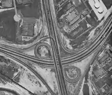 Before plans for the new route were finalized, a flyover was built to provide access from Belfield Road to eastbound Highway 401, opening on October 7, 1968.[9] Because the lands on which the freeway was to be built were occupied, the province elected to apply to expropriate the right-of-way in April 1972.[10] Construction was underway by the end of the year, with the first contracts constructing the trench section near Highway 27. Structures, drainage and grading were completed west of Iron Street to Carlingview Avenue in 1974. In June of that year, contracts were awarded for the same work east of Iron Street to Highway 401. When this was completed in 1975, a paving contract was awarded from Carlingview Avenue to Highway 401.[11]