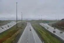 The final section of Highway 416 travels parallel to Cedarview Road, which was relocated for the freeway.[10] The Stony Swamp lies west of the route while farmland lies to the east.[6][11] At the northern end of the swamp is an interchange with West Hunt Club Road. The freeway continues through a section of greenspace before descending gently into a trench. It passes beneath Bruin Road and the Ottawa Central Railway while traveling alongside Lynwood Village in Bells Corners. The highway is crossed by Baseline Road and Richmond Road; the former provides an onramp to southbound Highway 416. The freeway ends at a large interchange with the Trans-Canada Highway, Highway 417 (Exit 131), just south of the Lakeview and Bayshore communities on the Ottawa River; downtown Ottawa is to the east and Kanata is to the west.[4]