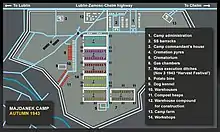3 November was dubbed "Bloody Wednesday" by Majdanek prisoners.[44] Following the operation, there were ten labor camps for Jews in the Lublin District (including Dęblin–Irena and Budzyń) with about 10,000 Jews still alive.[45] The Jews at Budzyń were not executed, despite the camp's status as a subcamp of Majdanek. According to survivors, a handful of Jews were taken from Budzyń to Majdanek, returning with bloody clothing and tales of the massacre. Israeli historian David Silberklang attributes the survival of the camp to the desire of local German functionaries to continue benefiting financially from slave labor and avoid a transfer to the front, but states it is unclear why the camp escaped Himmler's notice.[46]