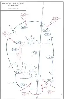COSVN strengthened their defenses by placing two regiments of the 9th Division along the border between the Fishhook region and War Zone C, while MG Mearns moved the 3rd Brigade into the northeastern part of War Zone C. By 29 December, the 3rd Brigade had established Firebase Burt (11.581°N 106.372°E) on Route 246, 12 km southeast of Firebase Beauregard. Firebase Burt measured 1 km from east to west and 500m from north to south, with a road running vertically through the middle. The command post and supply area was located at the center of the base. The 3rd Battalion, 22nd Infantry Regiment occupied 40 bunkers on the eastern half of the perimeter while the 2nd Battalion, 22nd Infantry Regiment, placed their M113 armored personnel carriers in Hull-down positions along the western perimeter. Fire support was provided by Batteries A and C, 2nd Battalion, 77th Artillery Regiment, placed their eleven 105-mm. howitzers in the south, five 155-mm. self-propelled howitzers of Battery A, 3rd Battalion, 13th Artillery Regiment in the north, a pair of M42 Dusters from Battery B, 5th Battalion, 2nd Artillery Regiment and a pair of quad mounted M55 .50-caliber machine-guns from Battery D, 71st Artillery Regiment.[1]:29