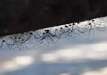 Particular patterns or color markings on harvestmen's bodies can reduce detection by disrupting the animals' outlines or providing camouflage. Markings on legs can cause an interruption of the leg outline and loss of leg proportion recognition.[23] Darker colorations and patterns function as camouflage when they remain motionless.[24] Within the genus Leiobunum are multiple species with cryptic coloration that changes over ontogeny to match the microhabitat used at each life stage.[22][25] Many species have also been able to camouflage their bodies by covering with secretions and debris from the leaf litter found in their environments.[22][26] Some hard-bodied harvestmen have epizoic cyanobacteria and liverworts growing on their bodies that suggest potential benefits for camouflage against large backgrounds to avoid detection by diurnal predators.[27][28]