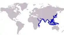 The orange-spotted trevally inhabits the tropical to subtropical waters of the Indian and western Pacific Oceans. It is distributed from Madagascar and the Comoros Islands in the west,[11] northwards to the Red Sea, the Gulf of Aden, and the Persian Gulf, and probably east toward India, although few fish have been recorded in this region.[5] It is commonly found from the Gulf of Thailand to Okinawa, Japan in the east, and southward to Indonesia, the Philippines, and New Britain.[8] In 2005, orange-spotted trevally reportedly had been caught in the Mediterranean Sea, indicating they had become Lessepsian migrants, passing through the Suez Canal to extend their range.[12] This claim has been disputed, though, with the source of the report coming under question due to the presence of other species unknown to the Mediterranean shown in the purported photograph.[13]