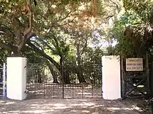 A 24-acre (10 ha) portion of the original estate, including the residence, gardens, oaks and citrus orchard, was designated as a Historic-Cultural Monument in January 1965. Those 24 acres (10 ha) were purchased by the City of Los Angeles in 1966 for $400,000.[5] The city-owned property includes a Spanish-style adobe residence, extensive gardens, oak trees hundreds of years old, Dayton Creek, nature trails, fruit orchards, rose gardens, community garden plots, picnic tables and a multitude of exotic trees, plants and shrubs.[5] Some of the more unusual trees found at the ranch are Purple Lily Magnolias, Lady Palms ( Raphis excelsus ) native to Asia, Bunya Bunyas ( Araucaria bidwillii ) evergreen native to Australia with cones weighing up to 15 pounds (7 kg)), Cork Oaks ( Quercus suber ), and one of the many Coast Live Oaks ( Quercus agrifolia ) measuring 32 feet (10 m) in circumference, believed to be 700 years old.[2][3][6][7] For 53 years (1927–1980), Ernest Conrejo was employed as the property's caretaker and gardener. Cornejo was hired at age 17 to plant and tend to the exotic trees and plants; he continued in that job until he was ousted at age 70 from his lifetime home by the city.[8]