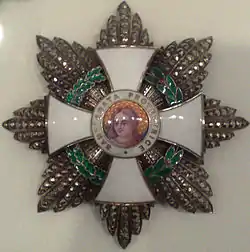 The badge of the order is a golden cross enamelled in white. It is charged on one side with a round golden shield bearing the effigy of Saint Agatha and includes the inscription Sant'Agata Prottetrice (Saint Agatha Protector). On the other side is written the epigraph Bene Merenti (to a well-deserving person). The cross is hung on a ribbon with five stripes of white, crimson and yellow.[2]