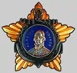 The Order of Ushakov (Russian: орден Ушакова) is a military decoration of the Russian Federation named in honour of admiral Fyodor Ushakov (1744–1817) who never lost a battle and was proclaimed patron saint of the Russian Navy. It is bestowed to command grade naval officers for outstanding leadership. The order was established in two classes during World War II by decision of the Presidium of the Supreme Soviet of the USSR of March 3, 1944.[1] The idea was given to Joseph Stalin by admiral Nikolai Gerasimovich Kuznetsov in the summer of 1943. Following the 1991 dissolution of the USSR, the Order of Ushakov was retained unchanged by Decision of the Supreme Soviet of the Russian Federation 2557-I of March 20, 1992[2] but it was not awarded in this form. The all encompassing Presidential Decree 1099 of September 7, 2010[3] that modernised and reorganised the entire Russian awards system away from its Soviet past amended the Order to its present form, a ribbon mounted single class Order.