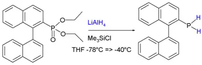 In addition to the other reactions associated with phosphines, those bearing P-H groups exhibit additional reactivity associated with the P-H bonds. They are readily deprotonated using strong bases to give phosphide anions. Primary and secondary phosphines are generally prepared by reduction of related phosphorus halides or esters, but phosphonates can also be reduced to primary phosphines, for example:[11]