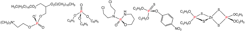 Illustrative organophosphates and related compounds: phosphatidylcholine, triphenylphosphate, cyclophosphamide, parathion, and zinc dithiophosphate.