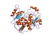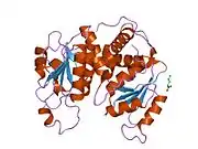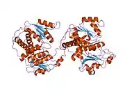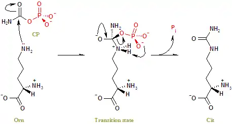 Ornithine transcarbamylase (OTC) (also called ornithine carbamoyltransferase) is an enzyme (EC 2.1.3.3) that catalyzes the reaction between carbamoyl phosphate (CP) and ornithine (Orn) to form citrulline (Cit) and phosphate (Pi). There are two classes of OTC anabolic and catabolic. This article focuses on anabolic OTC. Anabolic OTC facilitates the sixth step in the biosynthesis of the amino acid arginine in prokaryotes.[5] In contrast, mammalian OTC plays an essential role in the urea cycle whose purpose is to capture toxic ammonia and transform it into less toxic urea nitrogen source for excretion.