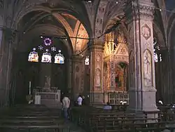 Inside the church is Andrea Orcagna's bejeweled Gothic Tabernacle (1355–59) encasing a repainting by Bernardo Daddi's of an older icon of the "Madonna and Child".[2]