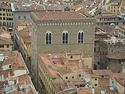 Located on the Via Calzaiuoli in Florence, the church was originally built as a grain market[1] in 1337 by Francesco Talenti, Neri di Fioravante, and Benci di Cione. Between 1380 and 1404, it was converted into a church used as the chapel of Florence's powerful craft and trade guilds. On the ground floor of the square building are the 13th-century arches that originally formed the loggia of the grain market. The second floor was devoted to offices, while the third housed one of the city's municipal grain storehouses, maintained to withstand famine or siege.[1] Late in the 14th century, the guilds were charged by the city to commission statues of their patron saints to embellish the facades of the church.[1] The sculptures seen today are copies, the originals having been removed to museums (see below).