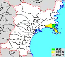 colored area=original extent in Meiji period; green=present area