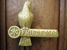 The town hall of Osnabrück is built in the late Gothic style. The exterior design of the building makes a considerable impact on the observer. The frontal view is characterised by an 18-metre-high hipped roof, whose height is almost equal to that of the rest of the building from the foundation slab to the eaves. A total of six towers are positioned at the lower end of the roof, reminiscent of watchtowers and corner towers of a fortress. In addition there has been a large flight of steps in front of the town hall since 1846, leading to the roughly 500-year-old entrance door from two sides (previously accessed via a retractable set of wooden steps). The handle of this door is made of heavy bronze and displays the year “1648”; it also features a dove.