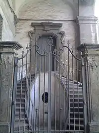 In the mid 18th century, Antonio Maggiocca was the patron for the building of the pharmacy. The structure was designed by Bartolomeo Vecchione. Maggiocca’s marble bust inside was sculpted by Matteo Bottiglieri in 1750. The pharmacy remains, generally intact with cabinets and nearly 400 maiolica vases (albarelli) for compounds, made by Lorenzo Salandra and Donato Massa. The tiled floors were made by Giuseppe Massa. The ceiling was frescoed by Pietro Bardellino. The Pharmacy consists of a grand salon, an entrance room, and a small laboratory. The latter is decorated in stucco and has an elaborate table by the woodworker Agostino Fucito.