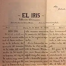 From 1907 to 1914 Castro attended El Vergel, a private school founded and directed by Raymundo Aveiga Moreira (1876–1959),[2] in Chone, Ecuador. At fourteen, under the tutelage and guidance of his teacher and with several of his schoolmates, most notably Enrique Amadeo Bolaños Moreira (1898–1929), he edited and wrote articles for Chone’s first cultural weekly, El Iris. The only newspaper available in Chone at the time was El Horizonte,[3] a weekly published in Portoviejo, the capital of Manabí province. El Iris was launched on April 23, 1916, its few copies painstakingly handwritten for lack of a printing press.[4] Good penmanship was a highly desirable and respected skill at the time and was part of El Vergel's eight-year curriculum along with the more traditional subjects. El Iris' readership consisted of a few families arbitrarily selected by the young publishers. There arose an aura of suspense every week among these families to see if they would be the ones to receive the prized manuscript. Many years later during a visit by cultural historiographer, Horacio Hidrovo Peñaherrera, Columba Coppiano Delgado was able to produce a pristine copy of El Iris destined specifically to her by the young journalists.[5] Items of interest were gathered from the private library of Guadalupe Martínez de Santos, a wealthy Mexican actress and neighbor; from illustrated magazines arriving from Europe which the boys were allowed to read at the post office before their patrons picked them up; and from news-about-town submitted by collaborating young itinerant reporters. Examples of these diverse topics were: the tercentenary of Miguel de Cervantes (most probably written by Bolaños); La Galerna, an account of the gales besetting the Cantabrian Sea (written by Castro),[6] social, literary, humor, and daily life columns, as well as updates on World War I. The students took sides: some for the Triple Alliance, some for the Triple Entente; that is to say, Germanophiles versus Francophiles. After perhaps seven issues and the acquisition of a printing press generously donated by Colonel Juan Crecencio Álvarez Loor, El Iris was taken over by the Centro Social Juventud Chonense.[7][8][9][10] By 1921, it was a well-established popular semanario chonense under the directorship of Ramón Verduga Cornejo.[11] Due to the exodus of many of its writers, El Iris folded in 1935.[10]