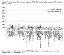Unlike traditional pensions, though, approximately 2/3 of the liabilities for "Other postemployment benefits" are at the local level. Large, progressive cities also face huge OPEB liabilities. For instance, New York City has an OPEB liability valued at $85.5 billion in the long term and costs the city $3 billion annually.[11] A 2009 report by the Government Accountability Office uncovered $129 billion in unfunded OPEB liabilities among just 39 large local governments.[12]