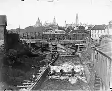 In 1843, Philip Thompson and Daniel McLachlin harnessed the Chaudière Falls for use with grist and sawmills.[14] In 1852, the Chaudière saw A.H. Baldwin, John Rudolphus Booth, Henry Franklin Bronson and Weston, J.J. Harris, Pattee and Perley, John Rochester, Levi Young.[14] All were American except for Rochester.[6] J.?. Turgeon operated a sawmill in the canal basin (another no longer existing area of the canal used for turning watercraft, just south of the bridge by the entrance).[6]