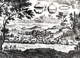 In the decade following the first publication of his own work von Guericke, in addition to his diplomatic and administrative commitments, was scientifically very active. He embarked upon his Magnum Opus — Ottonis de Guericke Experimenta Nova (ut vocantur) Magdeburgica de Vacuo Spatio — which as well as a detailed account of his experiments on the vacuum, contains his pioneering electrostatic experiments in which electrostatic repulsion was demonstrated for the first time and he sets out his theologically based view of the nature of space, but there are also contemporary arguments that he did not conceptualise these demonstrations as electrical.[11][13][14][15] In the Preface to the Reader he claims to have finished the book on March 14, 1663 though publication was delayed for another nine years until 1672. In 1664, his work again appeared in print, again through the good offices of Kaspar Schott, the first section of whose book Technica Curiosa, titled Mirabilia Magdeburgica, was dedicated to von Guericke's work. The earliest reference to the celebrated Magdeburg hemispheres experiment is on page 39 of the Technica Curiosa, where Schott notes that von Guericke had mentioned them in a letter of July 22, 1656. Schott goes on to quote a subsequent letter of von Guericke of August 4, 1657 in which he states that he now had carried out the experiment, at considerable cost, with 12 horses.[16]