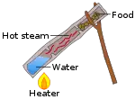 Steaming is possible with plants such as bamboo. In this method, a piece of bamboo is set diagonally above a fire. The bamboo is perforated from within (between the joints) and water is placed in the lowest bamboo segment. Food (e.g. rice) is then placed in the top segment which is steamed due to the water evaporating from the heat in the lowest segment.[1]